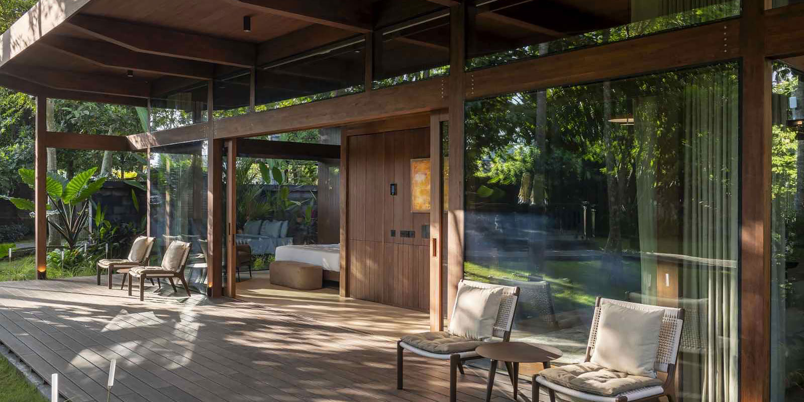 Деревянные двери выглядят эффектно, они отлично вписываются в дизайн дома из кирпича, натурального камня, бруса или бревна.