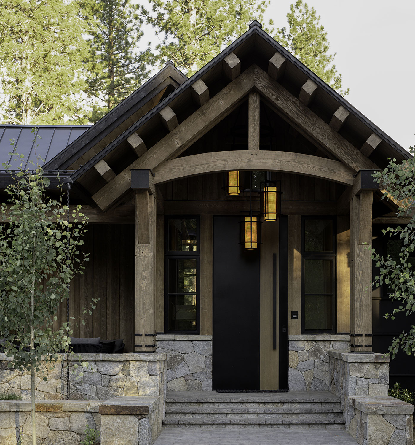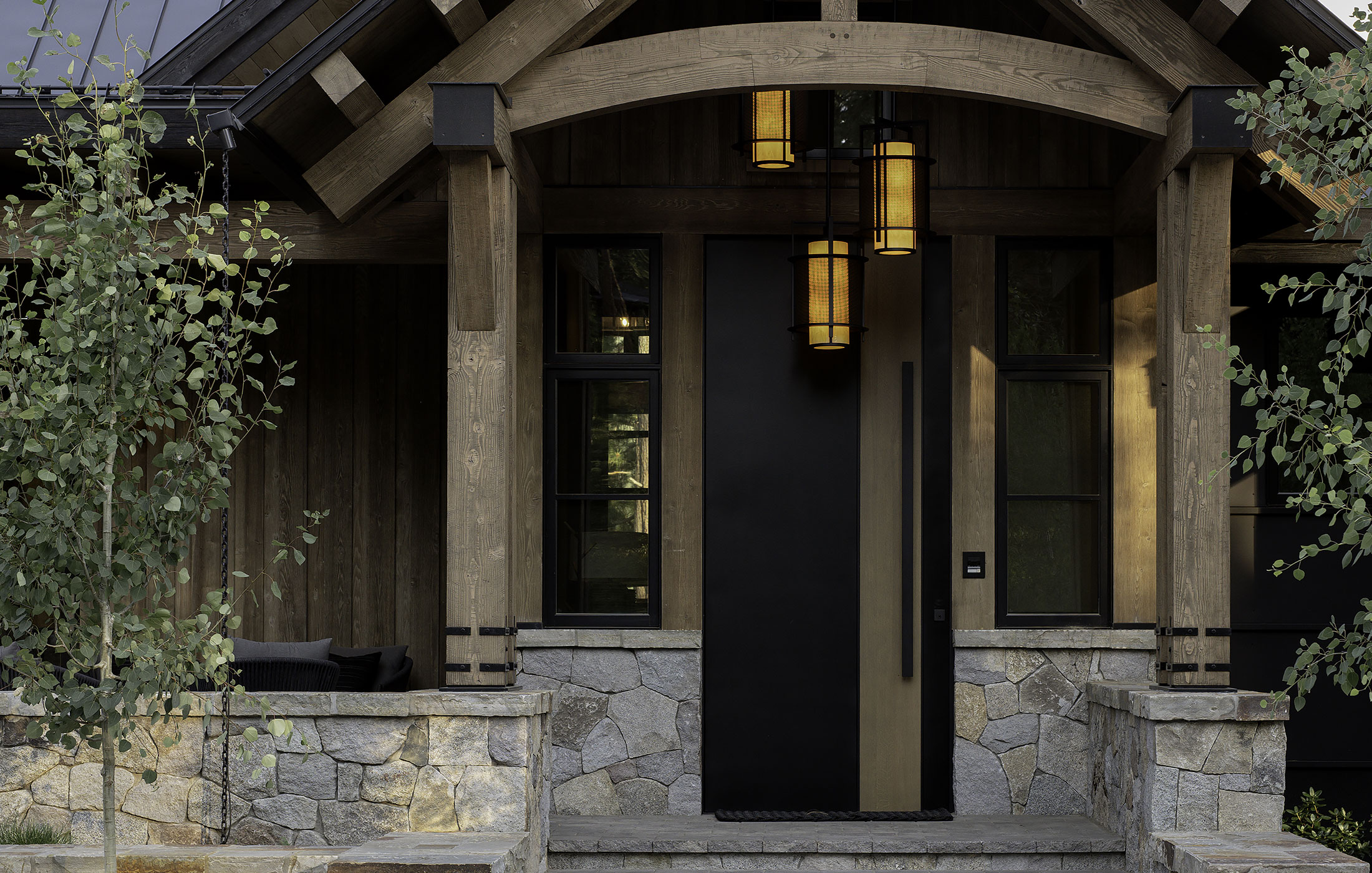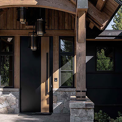 Деревянные двери выглядят эффектно, они отлично вписываются в дизайн дома из кирпича, натурального камня, бруса или бревна.