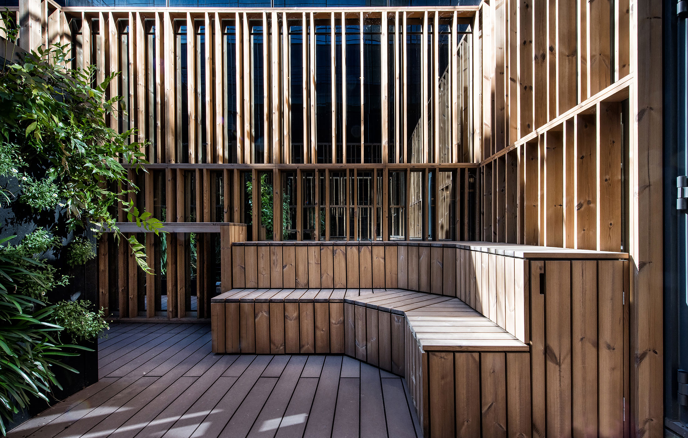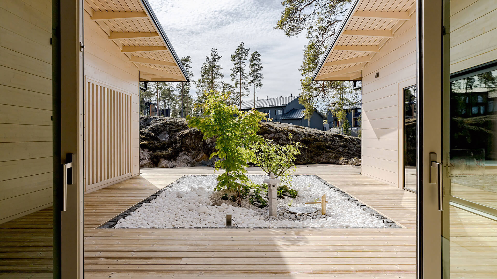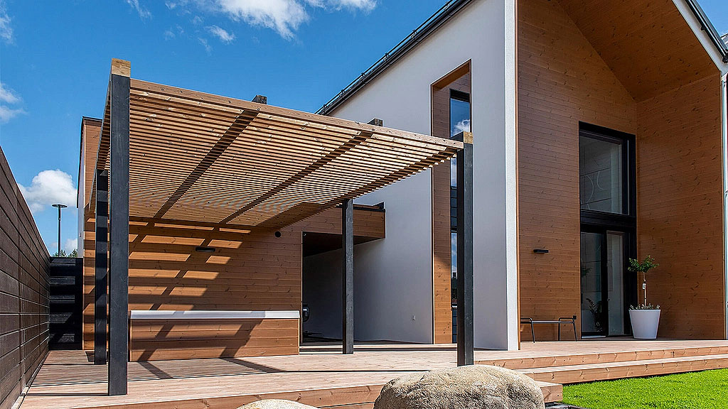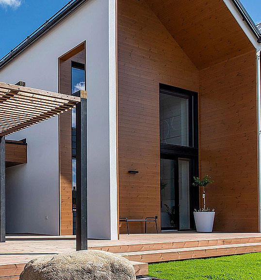 Также мы используем термодревесину — это древесный материал, который производится полностью без использования химикатов с помощью запатентованного процесса термической модификации. Высокая температура изменяет химические и физические свойства древесины, улучшая ее состав и эксплуатационные характеристики.