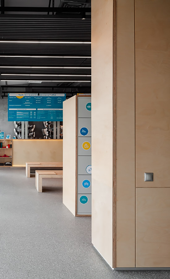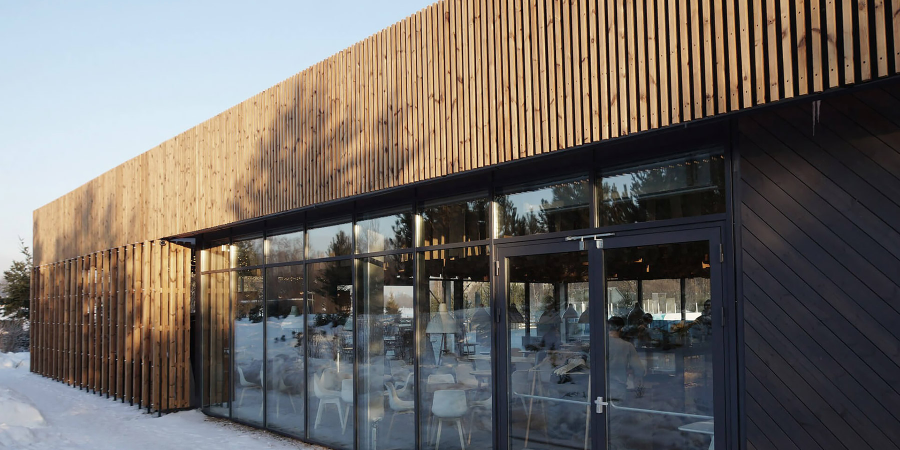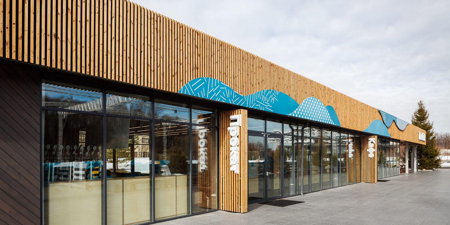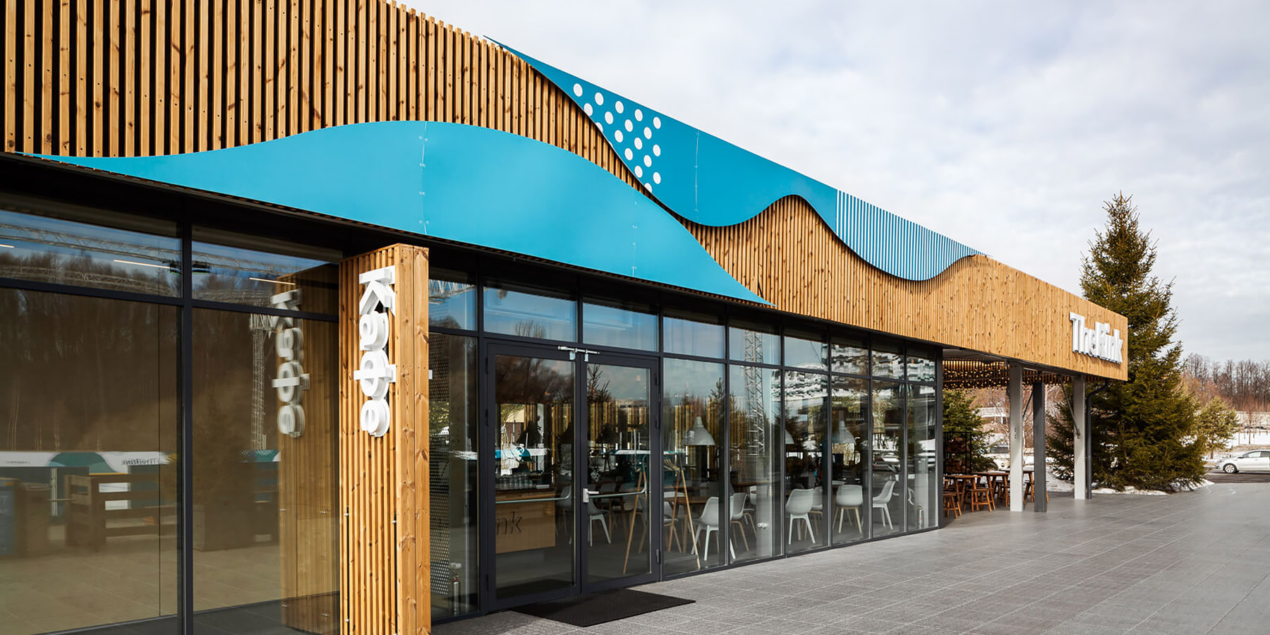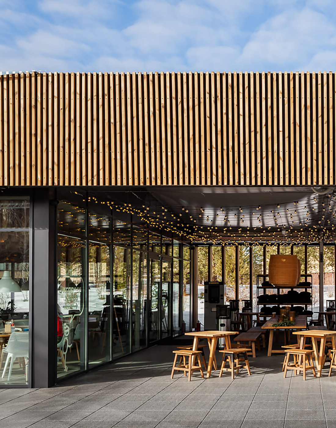 Новое общественное пространство украсило престижный район и стало долгожданным центром притяжения для местных жителей. Объект, созданный с применением простых, но эффективных решений, удовлетворил потребности в комфортном месте для общения и отдыха. В отделке использовались практичные и долговечные материалы: каучуковое покрытие и керамогранит для пола, тонированная фанера, штукатурка под бетон для стен, подвесные алюминиевые панели для потолка. Фасад выполнен из бруса и доски термососны, терраса — из лиственницы. Освещение обеспечила компания «Центрсвет / Centrsvet».