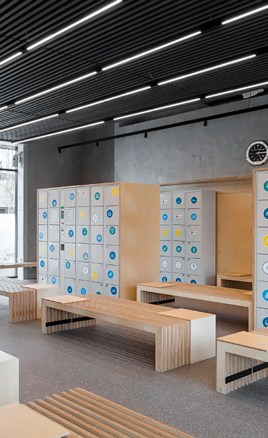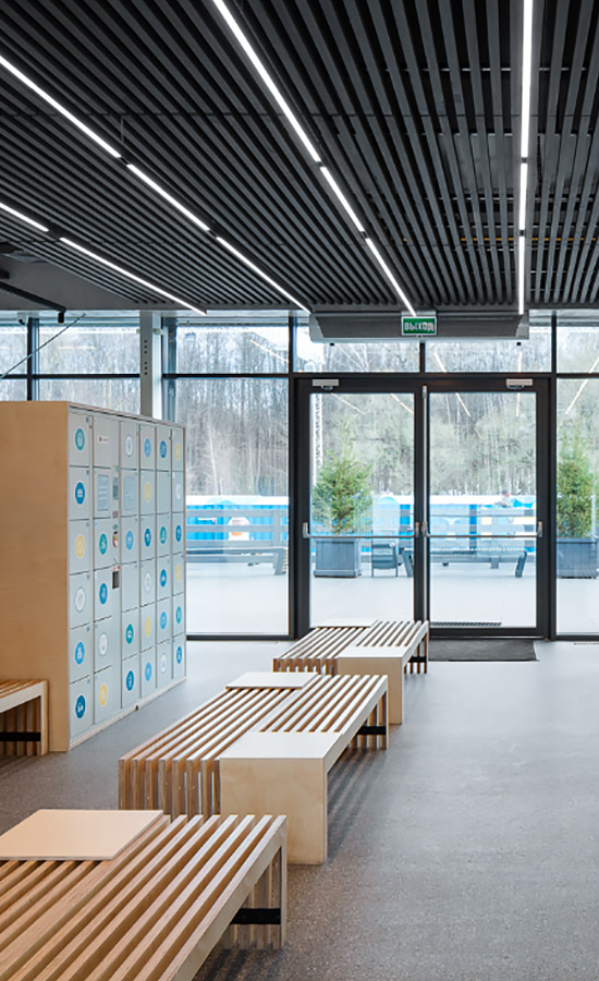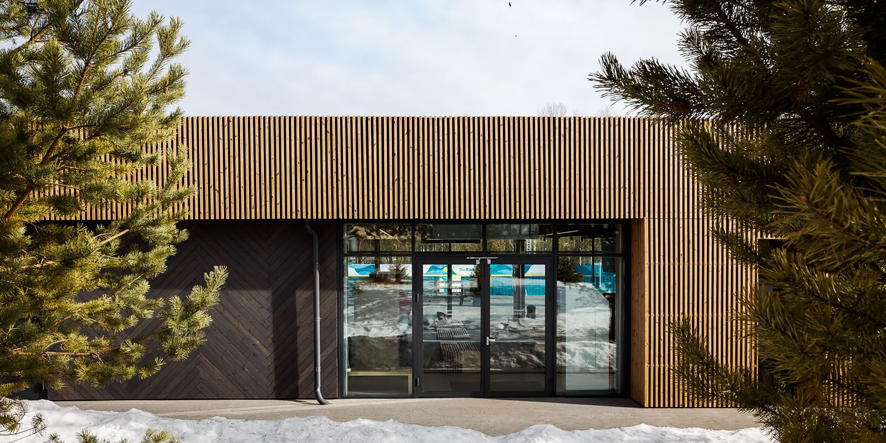 Ключом к успеху стало использование готового заводского каркаса. Основу здания составили каркасно-тентовые конструкции RODER, что позволило значительно ускорить процесс возведения. Фасад, облицованный термодревесиной, придал сооружению современный и экологичный вид, гармонично вписав его в окружающий ландшафт. Простота и лаконичность интерьеров были дополнены яркими акцентами в виде граффити, что создало атмосферу динамизма и творчества.
