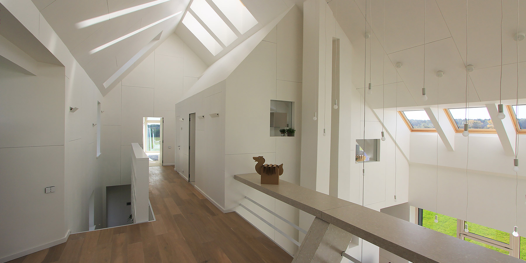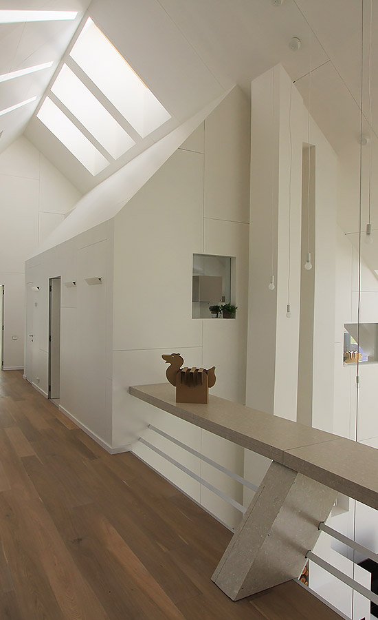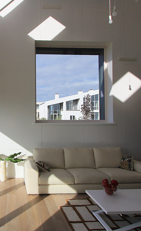 Дом, подобно современному прочтению старой русской избы, органично вписывается в окружающий ландшафт. Его вытянутая форма словно стремится уловить солнечные лучи, а асимметричный скат, обращённый к югу, создаёт динамичный силуэт. Этот дом — не просто строение, а живой организм, способный адаптироваться к меняющимся условиям внешней среды. Фасады, как живые ткани, реагируют на изменения погоды, создавая внутри уютную и комфортную атмосферу. Погодная станция отслеживает направление и скорость ветра, а каждая комната оборудована датчиками, определяющими температуру, уровень влажности и CO₂.