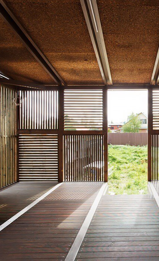 Архитектурное решение основано на сочетании простой формы здания с чётким функциональным планом и фасадом, составленным из деревянных элементов различной формы и цвета. Использованы различные методы отделки деревом: традиционные (доска внахлёст, доска внахлыст, простая доска), современные (вагонка, имитация бруса, блокхаус) и экзотические (отделка круглыми черенками от лопат и брусками разного сечения). Части фасада окрашены в различные оттенки коричневого цвета и закреплены под разными углами, что создаёт эффект разнообразного отражения солнечного света даже на одинаковых участках.