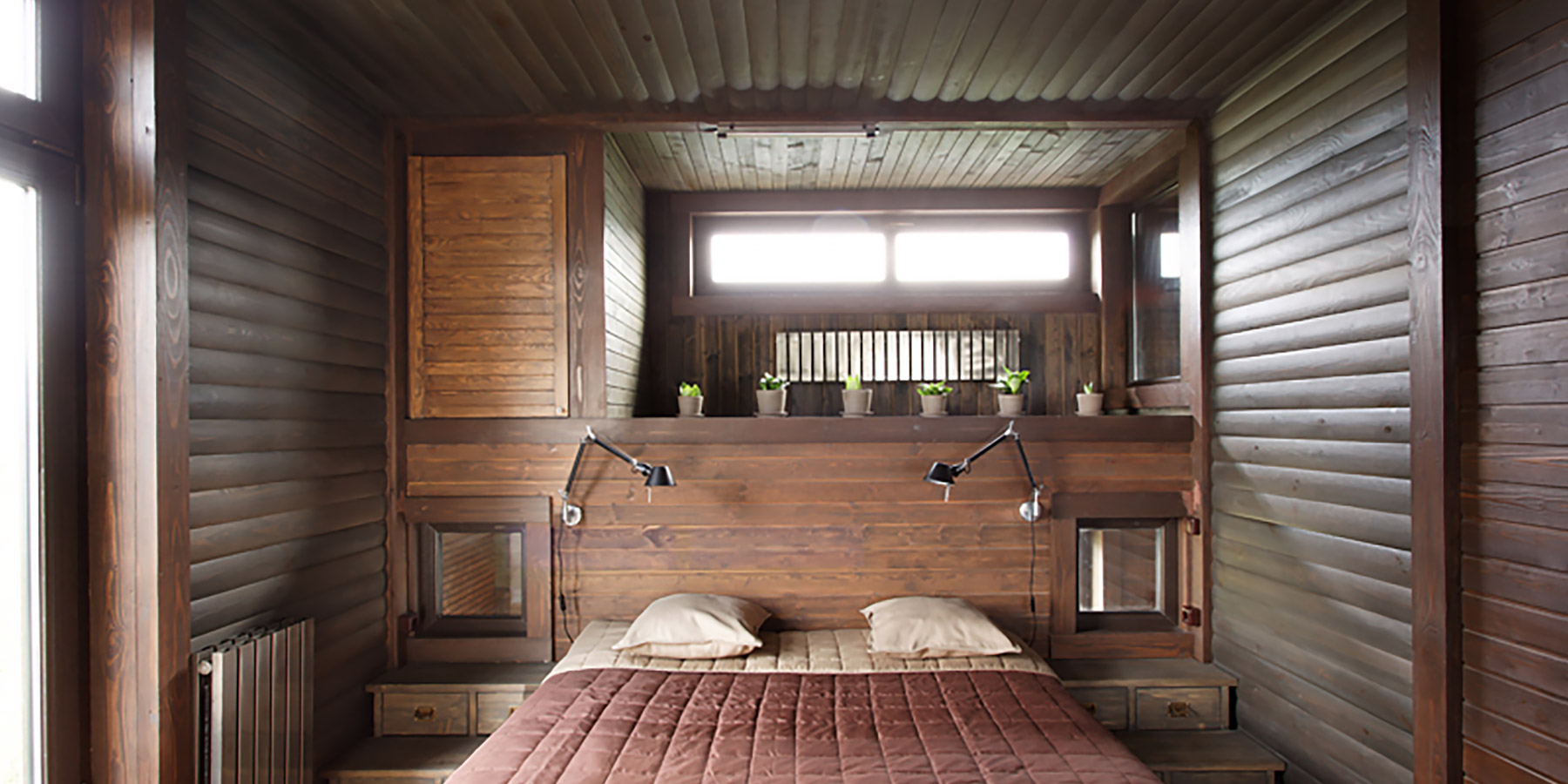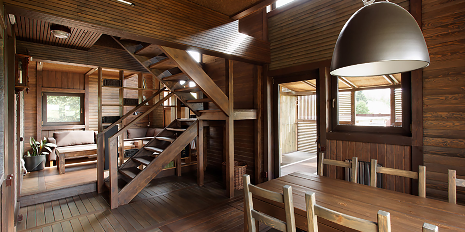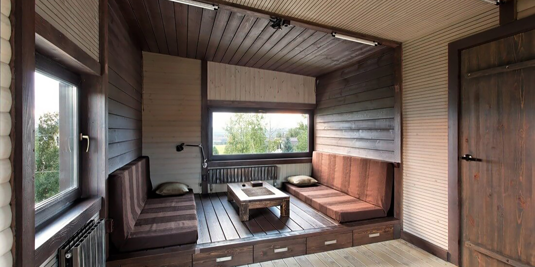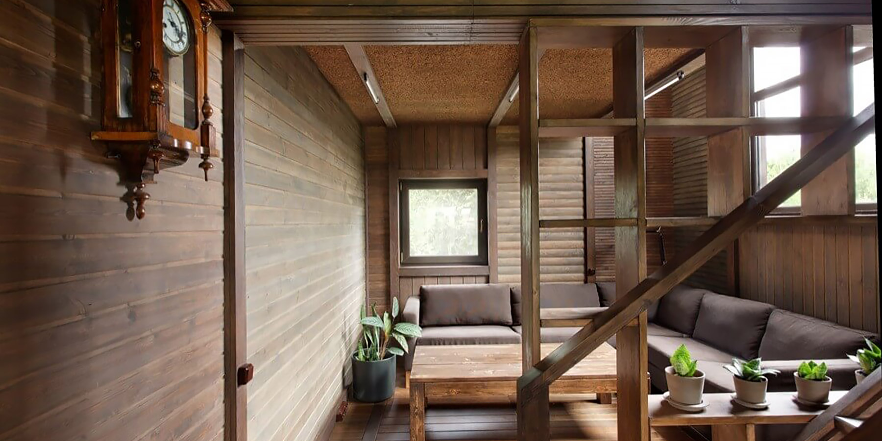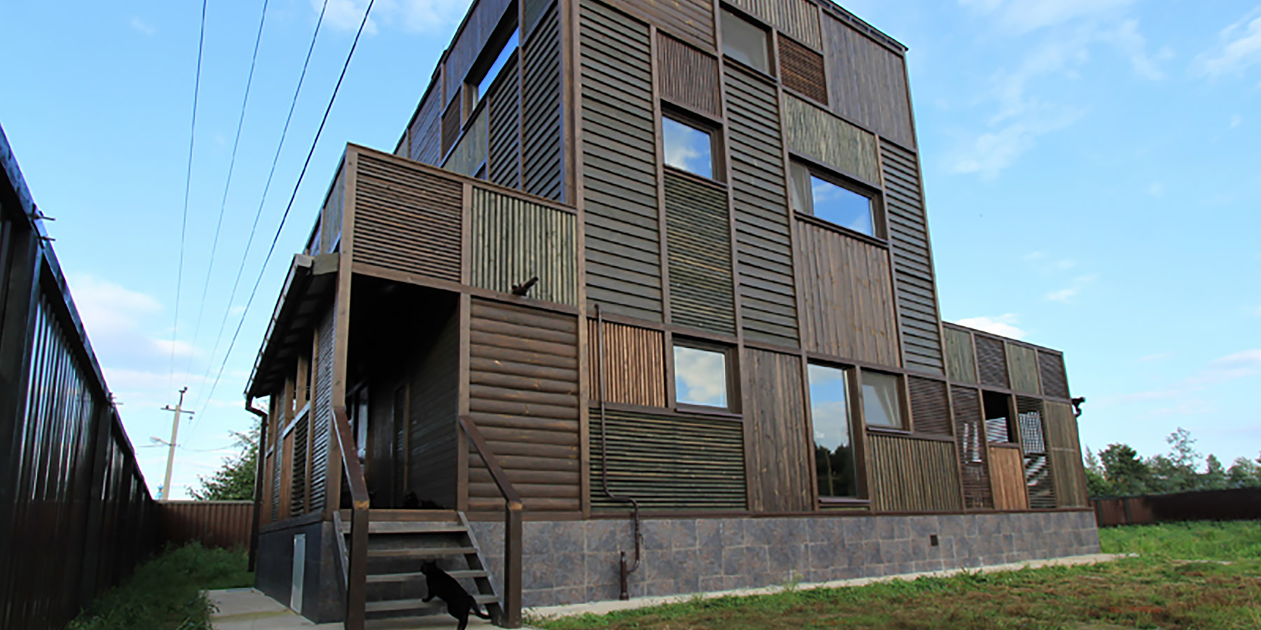 - Оригинальный дом в стиле patchwork, облицованный панелями-лоскутами из черенков от лопат, бруса, реек;