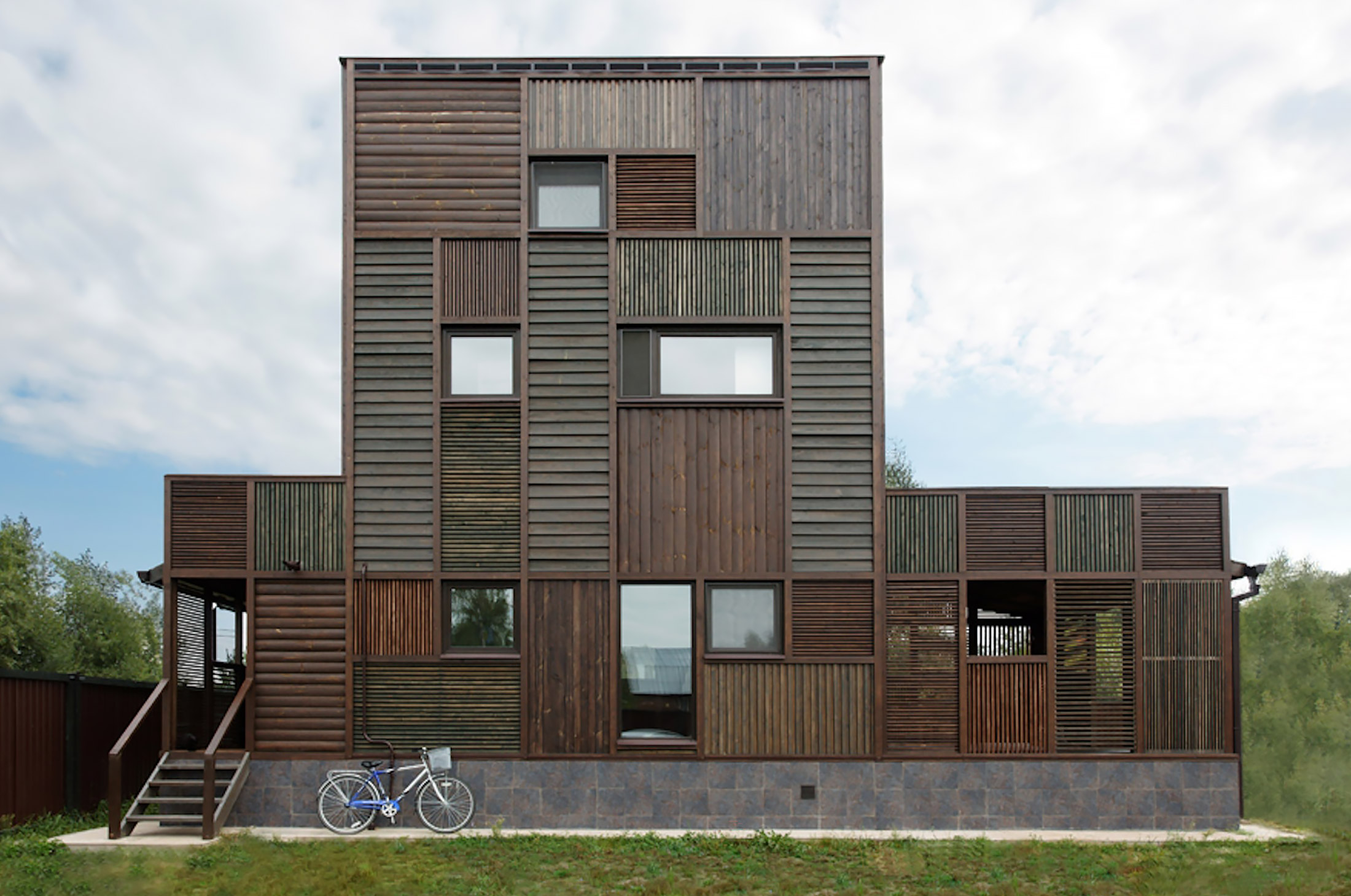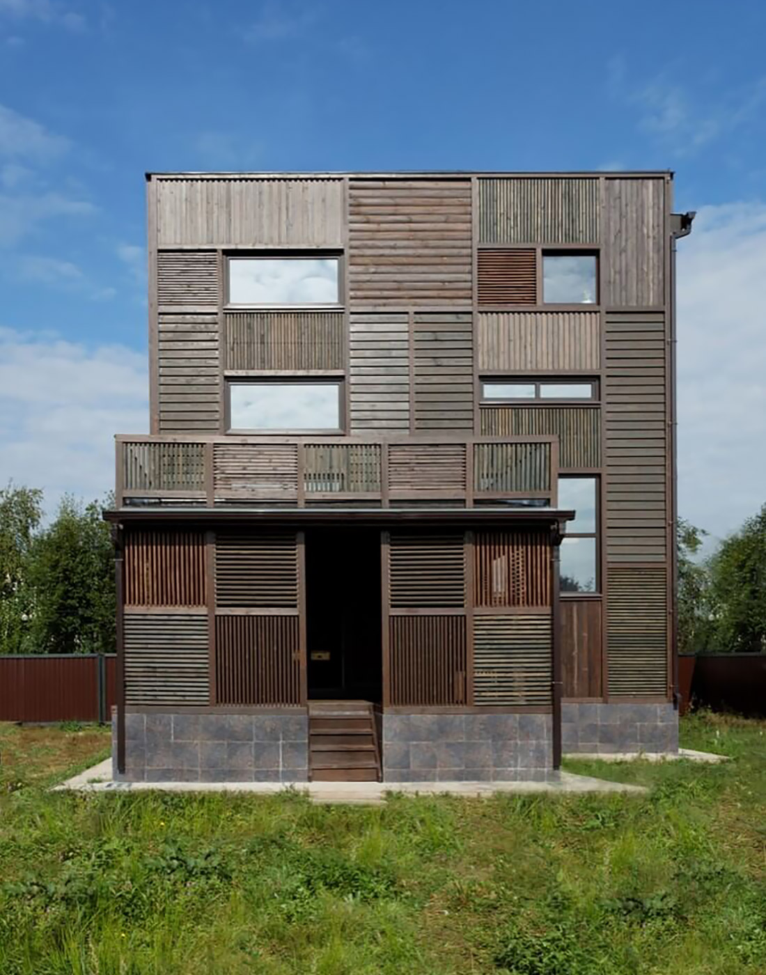 Wood Patchwork House — это деревянный трёхэтажный особняк, расположенный на берегу Волги. В этом проекте архитектор изящно и остроумно обыграл национальную традицию строить и латать дачные домики из подручных материалов. Лёгкий каркасный объём облицован решетчатыми деревянными панелями («лоскутами»), которые при ближайшем рассмотрении оказываются собранными из черенков от лопат, бруса и реек. Эти панели-ставни создают запоминающийся облик дома, одновременно защищая его от посторонних взглядов и пропуская дневной свет внутрь. Вся мебель была спроектирована Петром Костеловым, которому удалось достичь гармонии между экстерьером и интерьером.