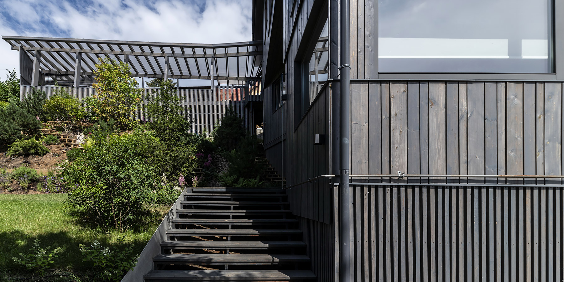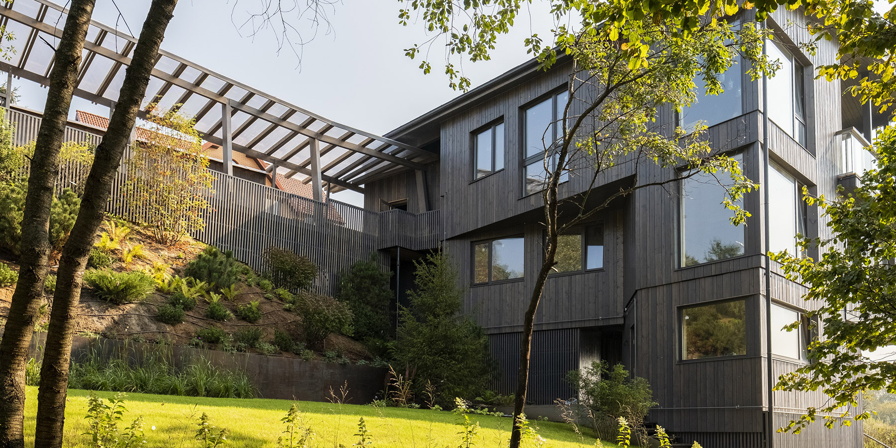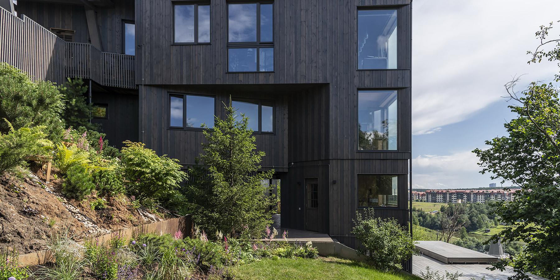 Умная организация пространства позволила создать виллу в 500 м² на достаточно компактном участке — дом полностью занял его изначальную площадь в 2,75 сотки. Участок, представляющий собой крутой склон, стал не препятствием, а отправной точкой для создания уникального архитектурного образа.