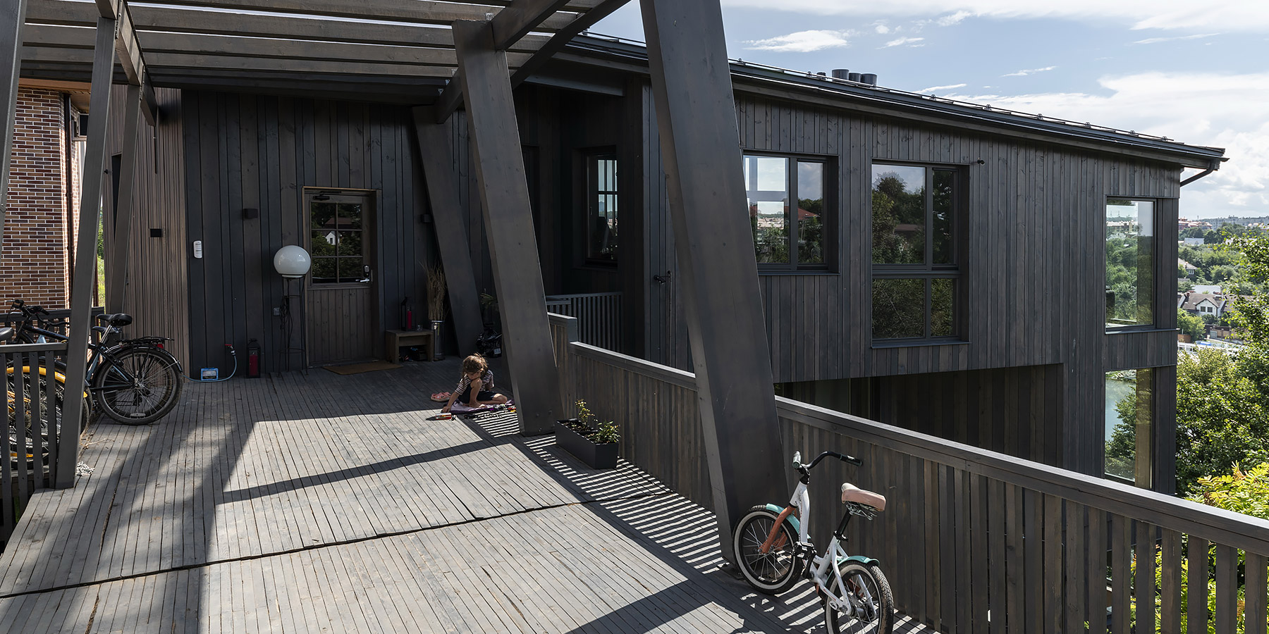 «Сложности, конечно, были, — рассказал Денис, — например, участок расположен под уклоном выше 45 %, и нам пришлось дополнительно спроектировать и построить мост, чтобы подойти к дому. Это обстоятельство во многом определило внешний облик сооружения и его планировочную структуру. Само строение выполнено полностью из дерева, включая все внутренние перегородки и отделку. Это частный дом, в котором сейчас живет его владелец. Площадь дома составляет 354 квадратных метра».