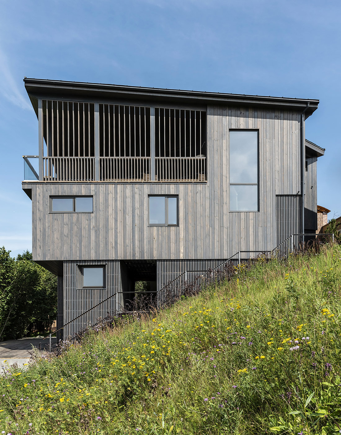 Расположенная на вершине холма, вилла представляет собой смелый эксперимент в области современной архитектуры. Единственный путь к дому — мост над обрывом, необходимый для доступа к дому. Изначально к участку не было дороги, а теперь мост подчеркивает изолированность и уникальность здания. Панорамное остекление позволяет полностью погрузиться в окружающий ландшафт — открывается вид на озеро с высоты, а слаломная гора, расположенная неподалеку, становится частью живописной композиции.