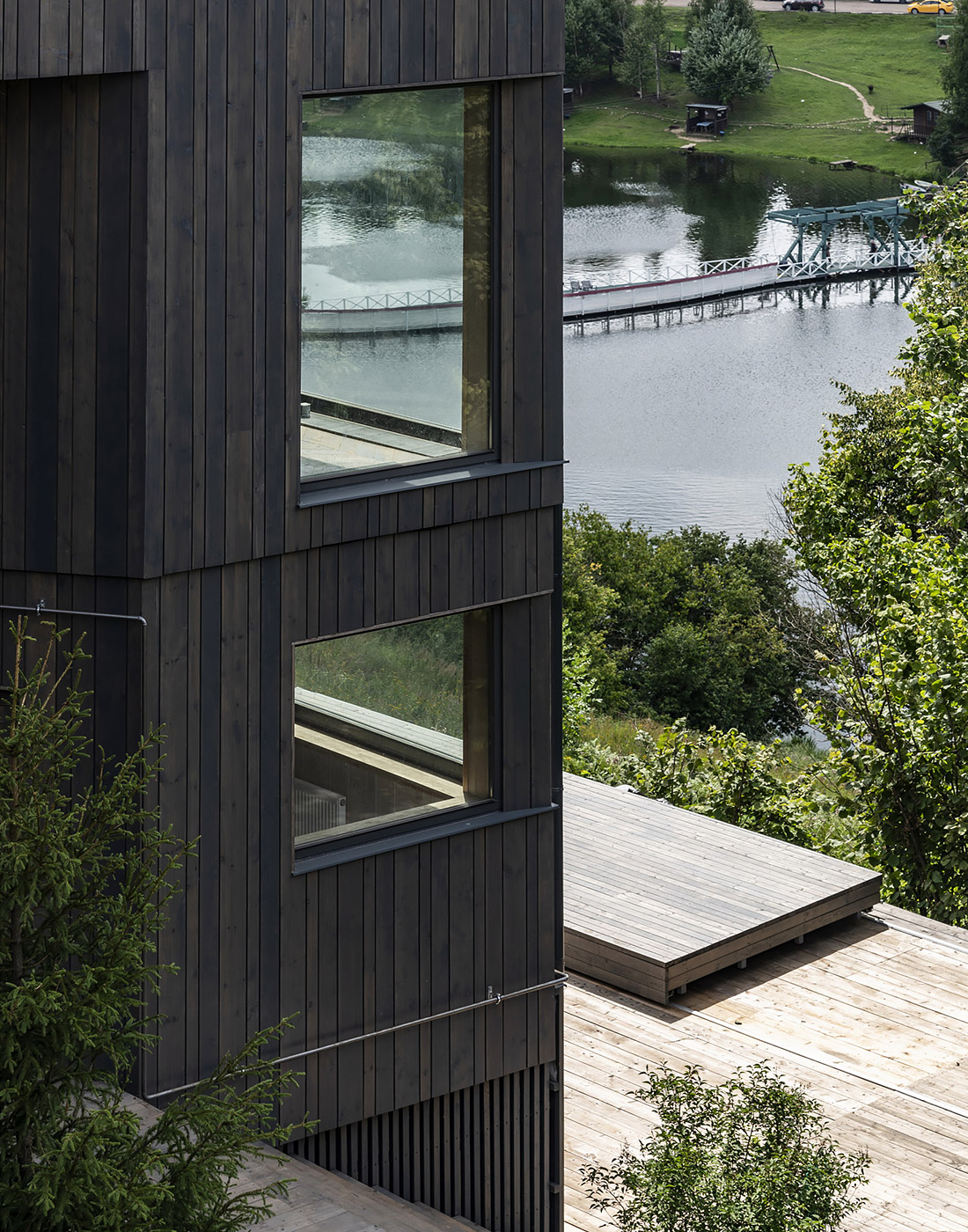 Здание представляет собой современную интерпретацию множества архитектурных приемов. Система внутренних и внешних пространств, созданная благодаря сквозному пассажу, лестницам и террасе, напоминает слегка традиционные японские дома. Деревянная отделка фасадов сосновыми досками разной ширины и маскировка свайного фундамента тонкими рейками отсылает к народной архитектуре, а скрытый фундамент подчеркивает легкость и воздушность конструкции.