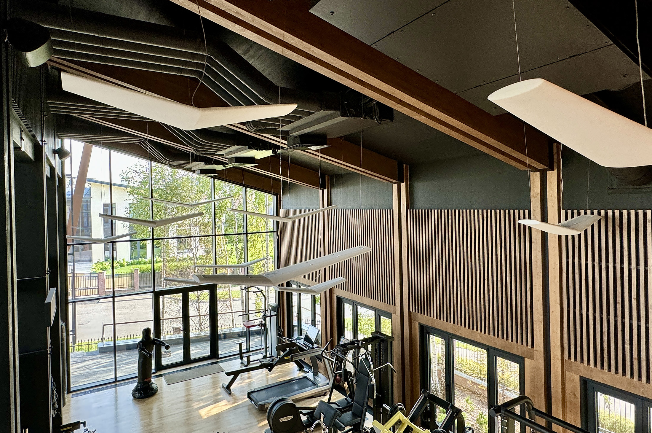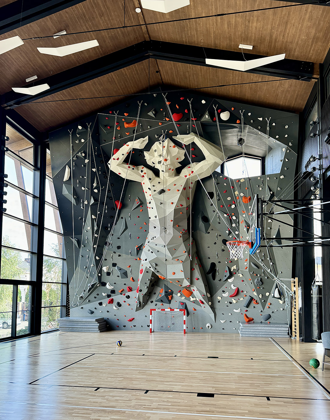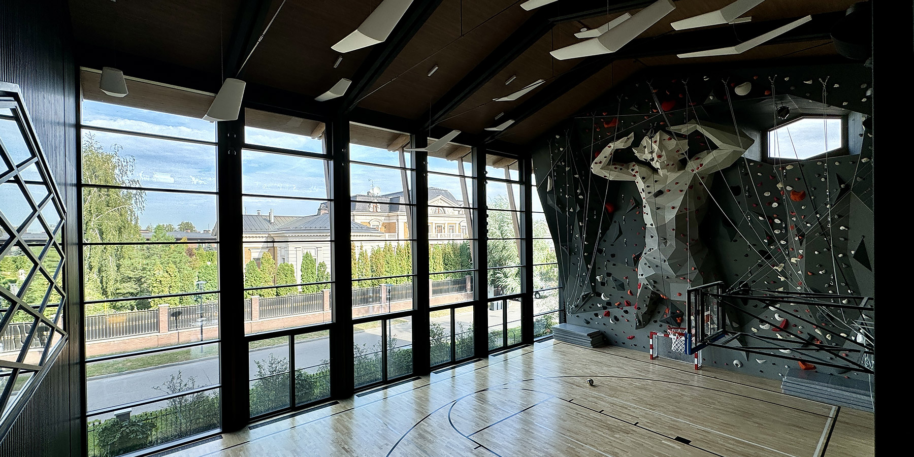 Гараж расположен в цокольном этаже и выполнен из бетона, что обеспечивает прочность, надёжность и защиту от влаги. Бетонный цоколь служит устойчивым основанием для верхних этажей. Спортивный зал находится в надземной части здания. При строительстве использованы экологически чистые материалы, способствующие созданию здоровой и комфортной атмосферы для занятий спортом.