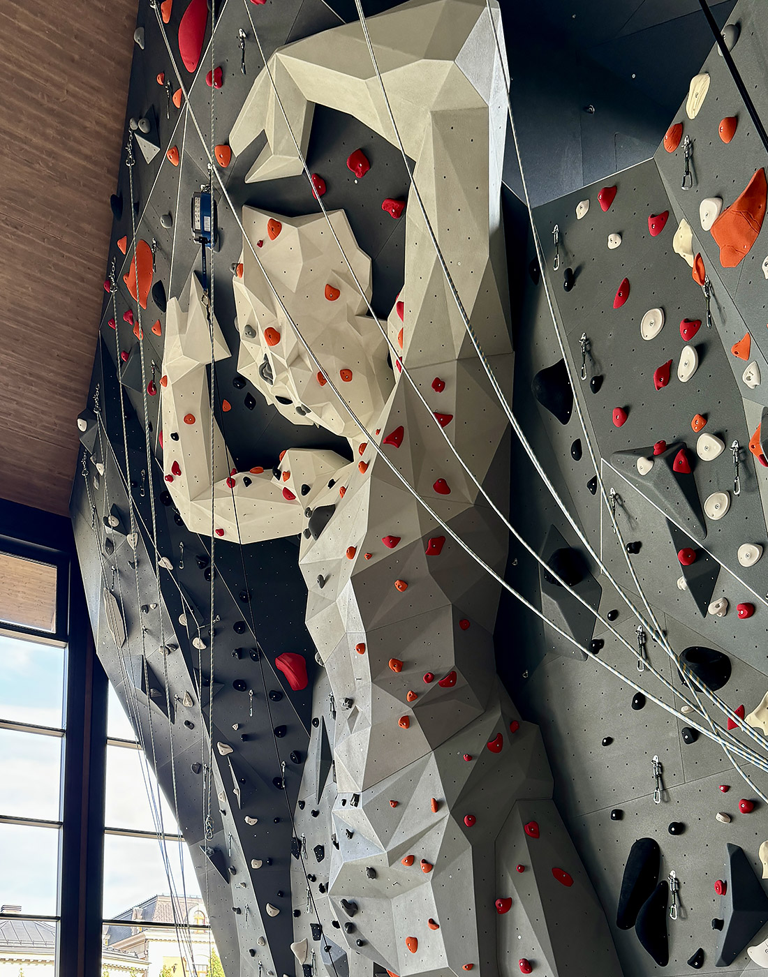 Основной материал отделки — вертикально ориентированная деревянная обшивка, вероятно выполненная из термодревесины, что придаёт зданию естественный и тёплый внешний вид. Крыша многоскатная, с большими свесами, защищающими фасад от атмосферных осадков. Свесы поддерживаются наклонными деревянными балками, которые играют важную роль в визуальном образе здания. Панорамное остекление обеспечивает хорошее естественное освещение внутренних помещений.